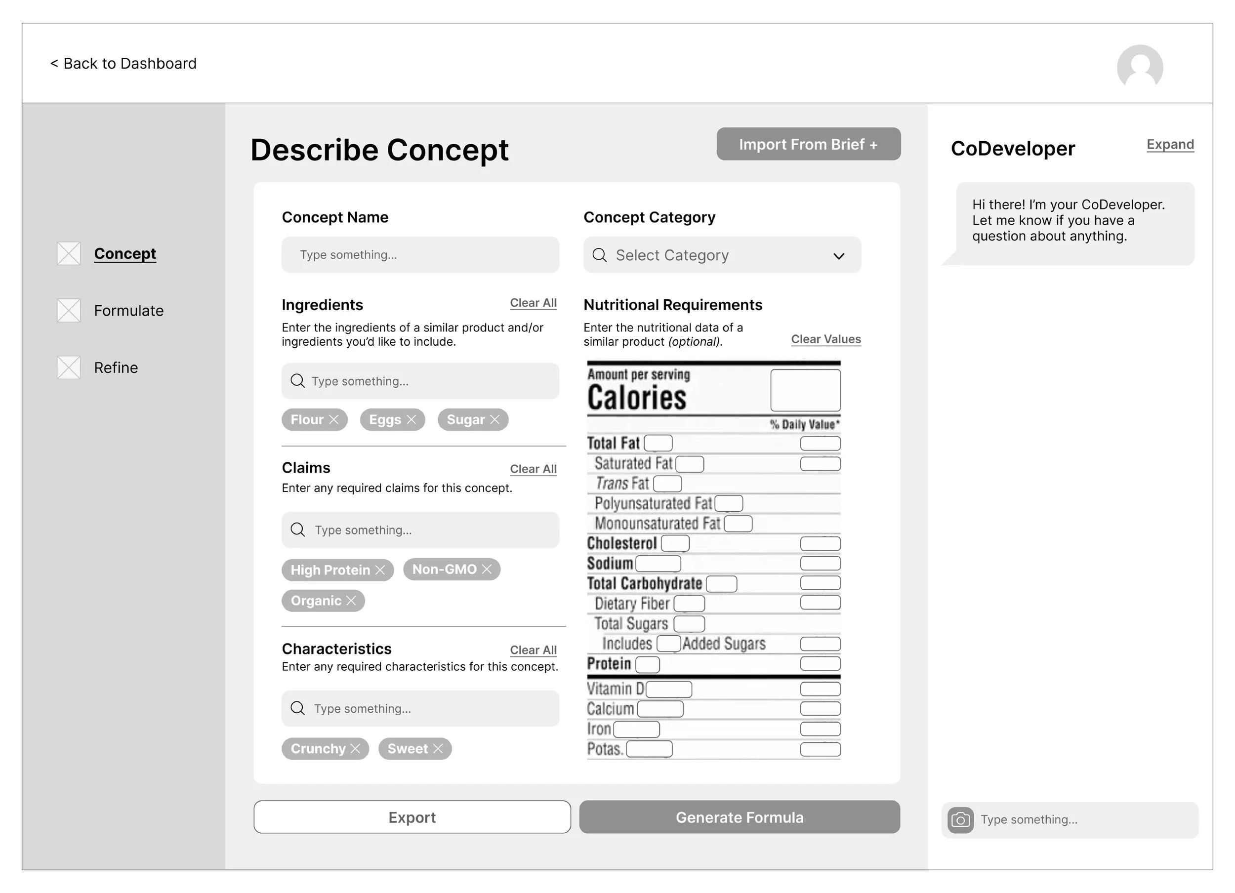 One key item that we tested was two methods of starting a new concept: Version 1 showed manual inputs for ingredients, claims and characteristics plus the ability to take a photo of an existing product label to start from. The second version featured using a conversation with the CoDeveloper AI as a way to begin the process.