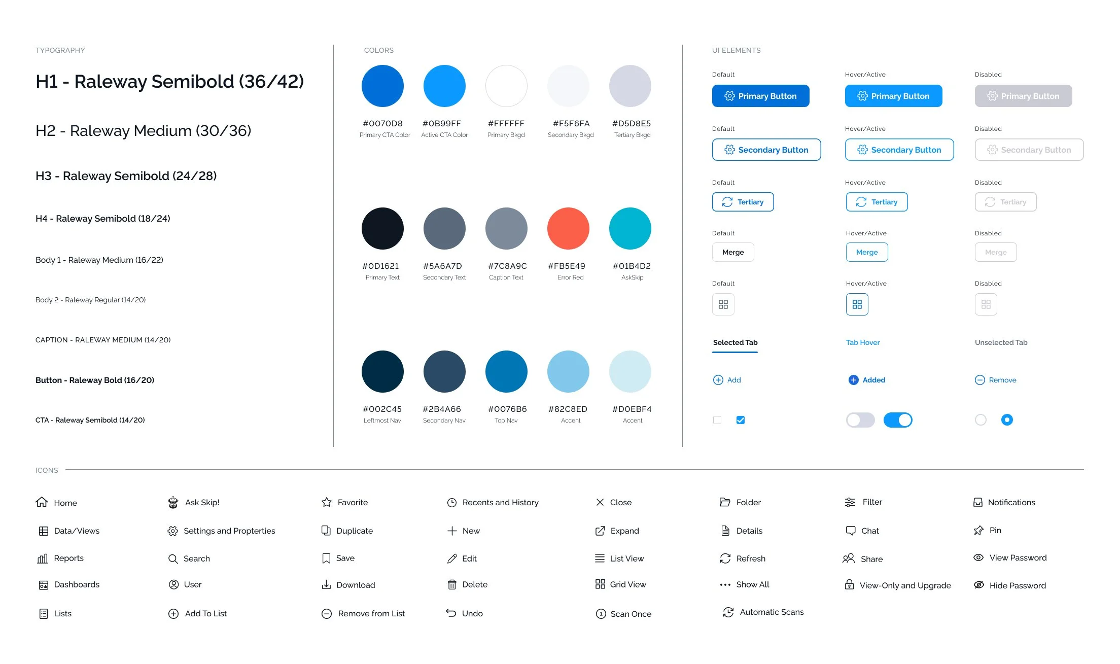 Because v1.0 was created with generic elements from developer sources, it was important to create a unique UI system for consistent, memorable design that would evolve with future updates. I created the following system of fonts, colors and elements to provide this product with a professional yet modern look and feel.